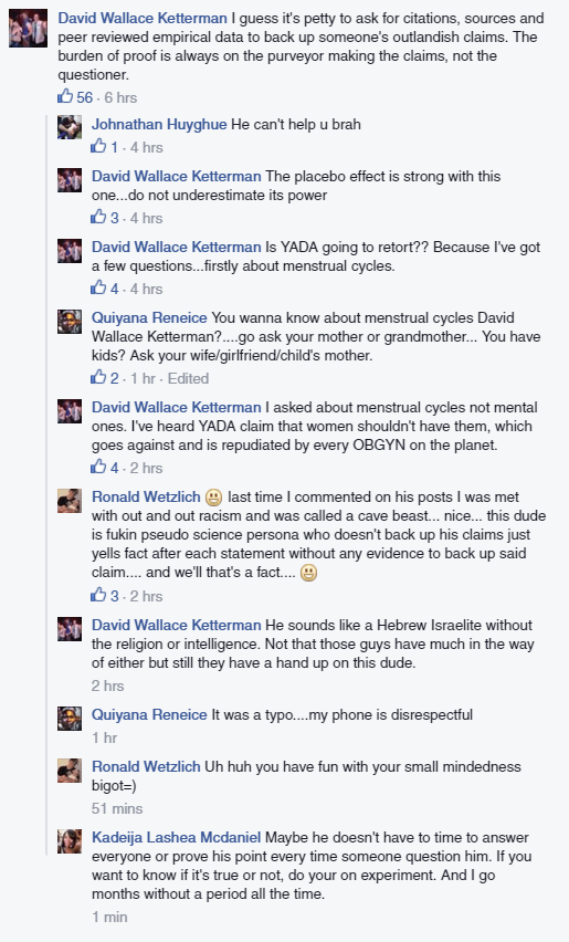 Around the beginning of March, I came across a Facebook post by a gentleman who willingly chooses to refer to himself as “YADA” shared to the group Things Woonatics Say. It was a video that went pretty viral, so I felt like I had to do a video response to it. I also posted it on YouTube, which evidently got shared around somewhere, as the comment section on YouTube is a minefield of nonsense.