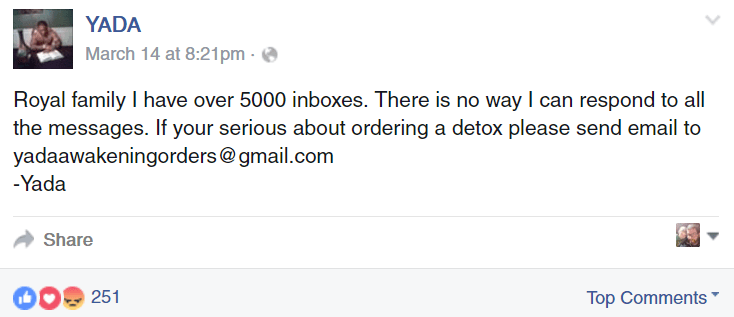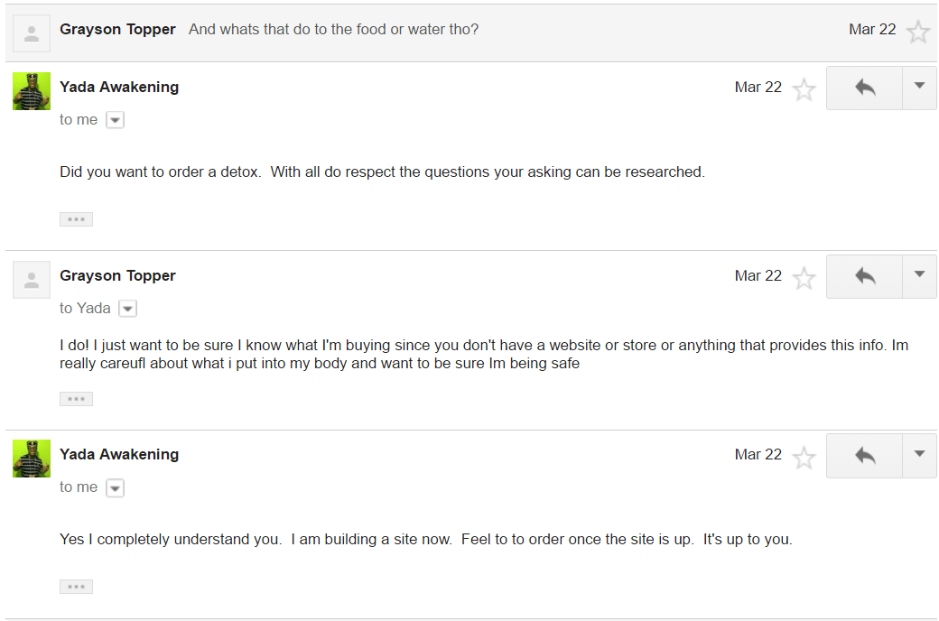 He does all this in order to try to sell his “detox.” Anyone with the slightest shred of scientific literacy knows that detoxes are bullshit, but scam artists make their living by sounding credible and tricking people into believing them. When YADA’s page exploded after his viral video, he was inundated with messages to the point that he offered up an email address to contact him to try to buy his “detox” plan.